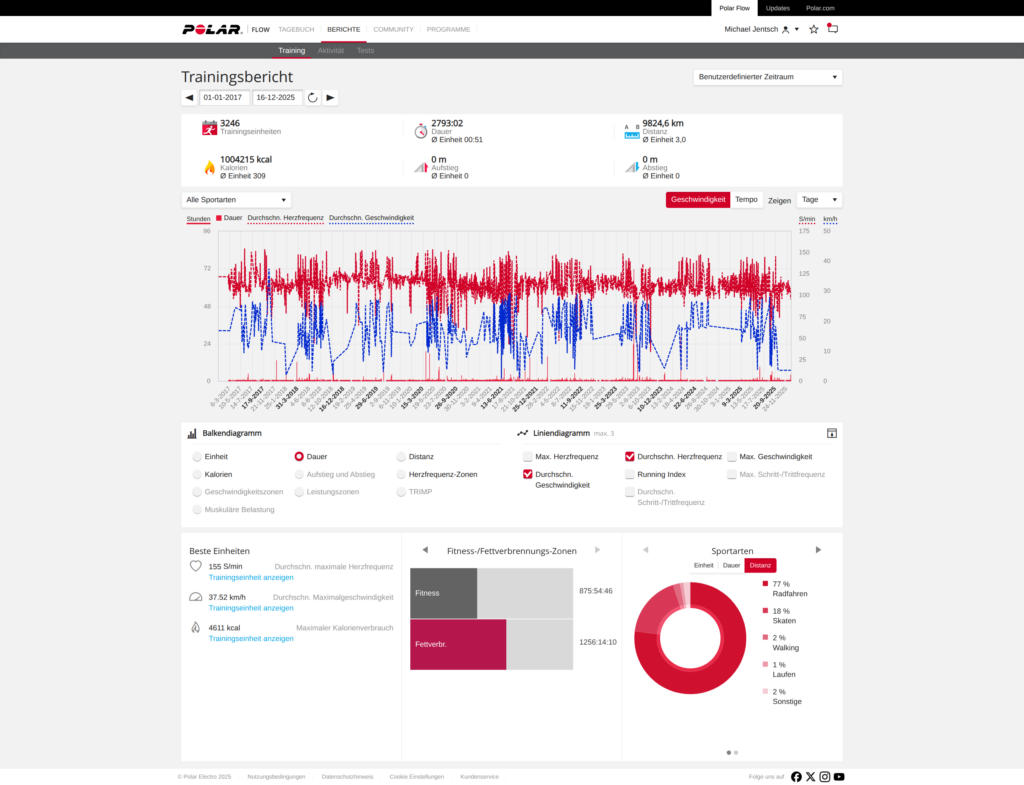 Heute werfe ich einen Blick zurück auf einen Zeitraum, der am 1. Januar 2017 begann und bis heute, in den 16. Dezember 2025, reicht. Ein Blick auf mein Polar Flow Tagebuch zeigt nicht nur bunte Balken und Linien, sondern die Geschichte meiner sportlichen Aktivität.