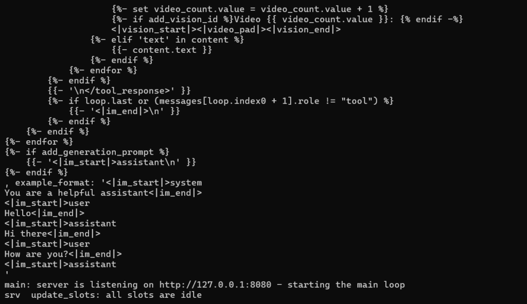 Nachdem ich die Zip Dateien entpackt und das die gguf Datei kopiert habe kann ich mit dem folgenden Befehl den llama.cpp Server starten: