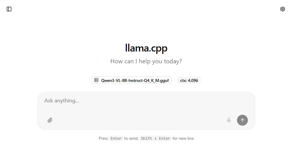 Der llama.cpp Server läuft nun auf Port 8080 und man kann im Browser http://localhost:8080/ eingeben und sollte folgende Seite sehen.