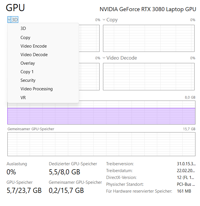 Im Taskmanager kann man sehen, dass etwas 5,5 GB von 8GB VRAM für das Modell benötigt werden. Wie erwartet passt das Qwen Modell gut in den VRAM der RTX 3080.