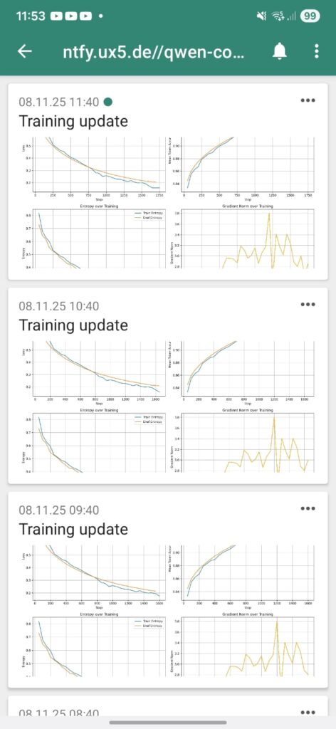 Das Trainieren oder Finetuning von großen Sprachmodellen (LLMs) ist oft ein langwieriger Prozess, der sich über viele Stunden oder sogar Tage erstrecken kann. Währenddessen ständig den Fortschritt im Auge zu behalten, kann mühsam sein. Man muss sich per SSH auf dem Trainingsserver einloggen, TensorBoard starten oder Log-Dateien durchsuchen. Das ist nicht nur umständlich, sondern auch leicht zu vergessen.