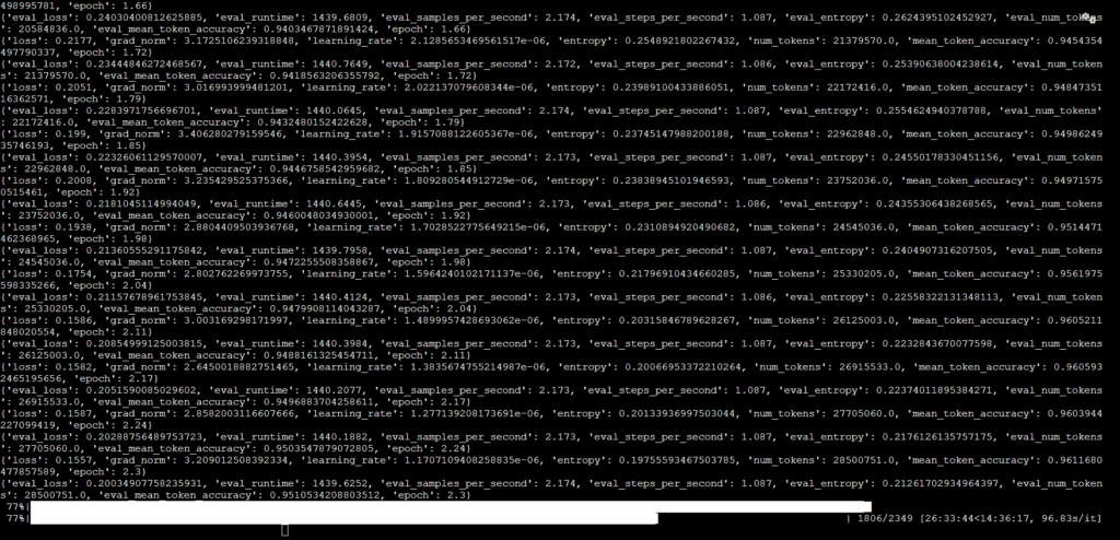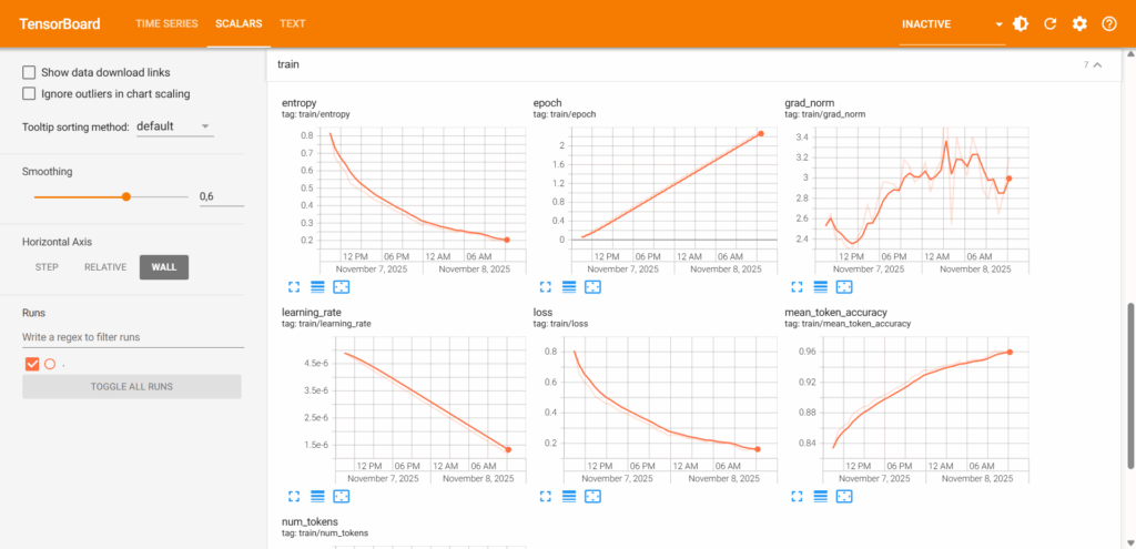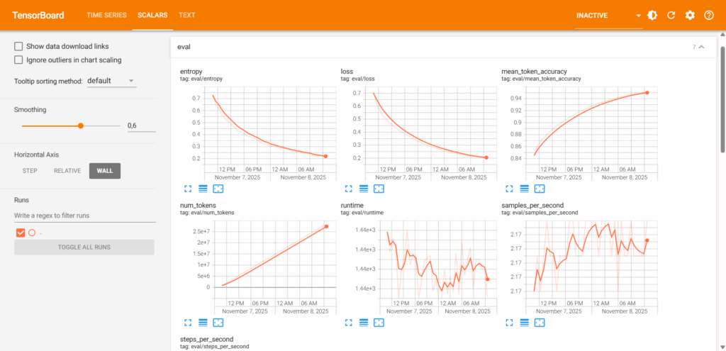 Diese Klasse lädt die binären Log-Dateien (.tfevents), die von deinem Training-Framework (z.B. PyTorch, TensorFlow, Hugging Face Trainer) geschrieben werden. Hier muss man den Pfad zu der spezifischen Logdatei anpassen. Könnte man schöner machen, aber ….- Daten extrahieren