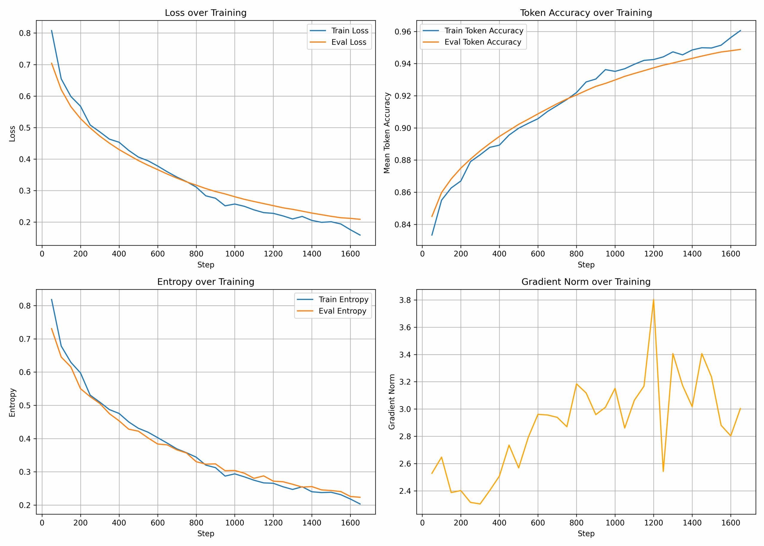 Dies ist die wichtigste Metrik. Sie zeigt, wie gut das Modell lernt, die Trainingsdaten vorherzusagen. Sowohl der Trainings- als auch der Evaluierungsverlust sollten idealerweise sinken. Steigt der Evaluierungsverlust, während der Trainingsverlust weiter sinkt, ist das ein Zeichen für Overfitting. - Token Accuracy over Training (Token-Genauigkeit)