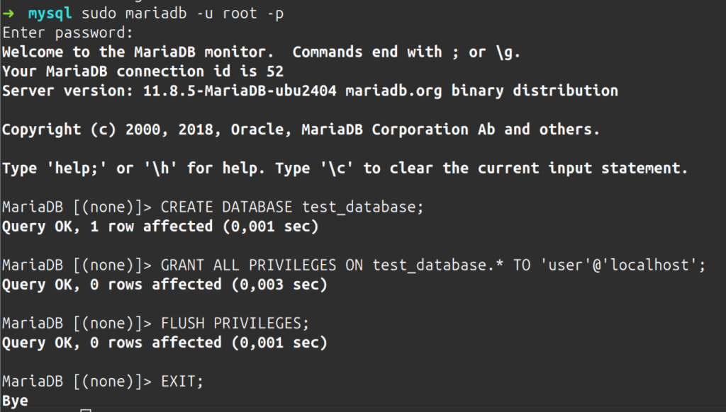 Damit ist die Datenbank angelegt und der Benutzer „user“ hat alle Rechte und man kann sich aus MariaDB ausloggen.