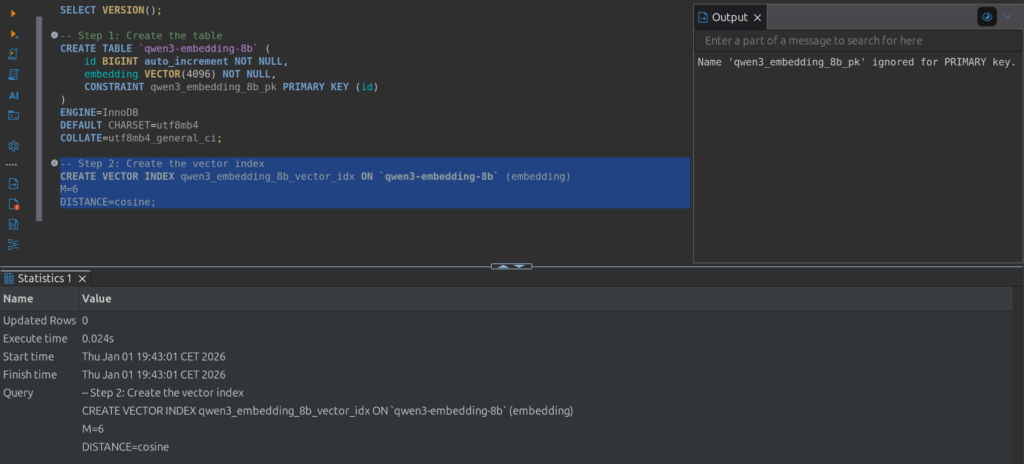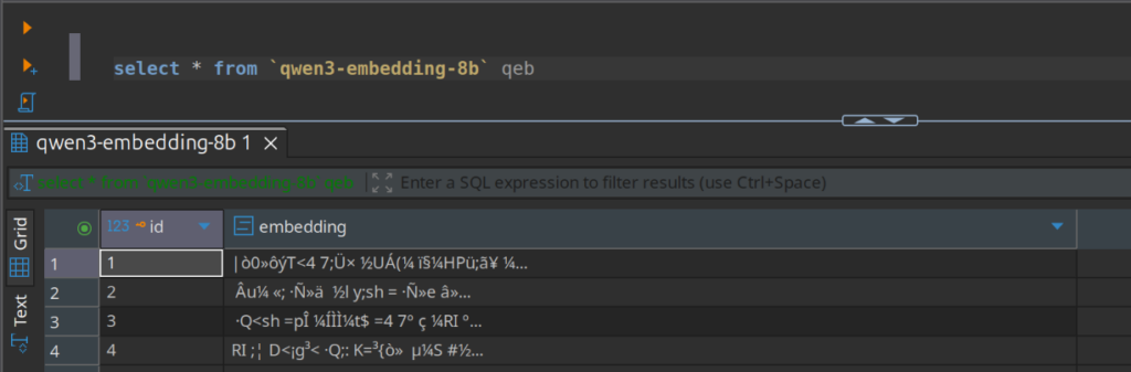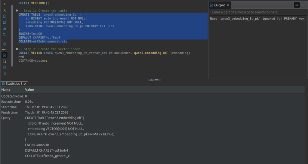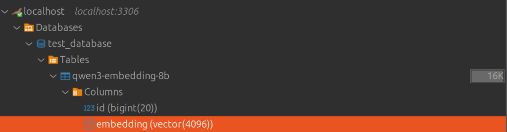 Diese visuelle Bestätigung zeigt auf einen Blick, dass MariaDB den VECTOR-Datentyp korrekt erkannt und mit der angegebenen Dimension von 4096 eingerichtet hat. Dies ist ein Indikator dafür, dass die zugrunde liegende MariaDB-Instanz Vektordaten nativ unterstützt und die Tabelle bereit ist, die vom qwen3-embedding-8b-Modell erzeugten Embeddings aufzunehmen.