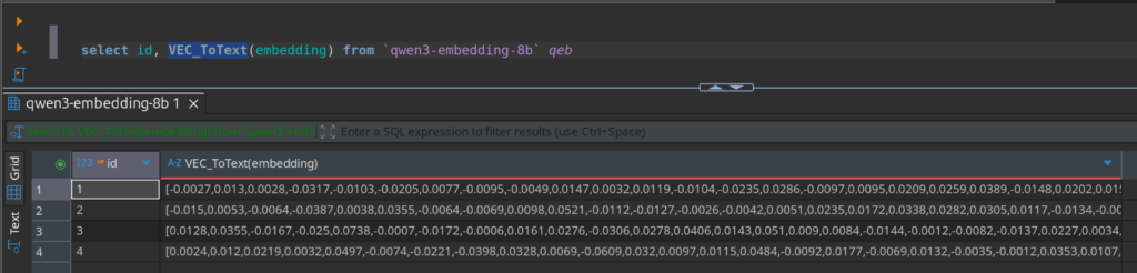 sql = "INSERT INTO `qwen3-embedding-8b` (embedding) VALUES (VEC_FromText(?))"