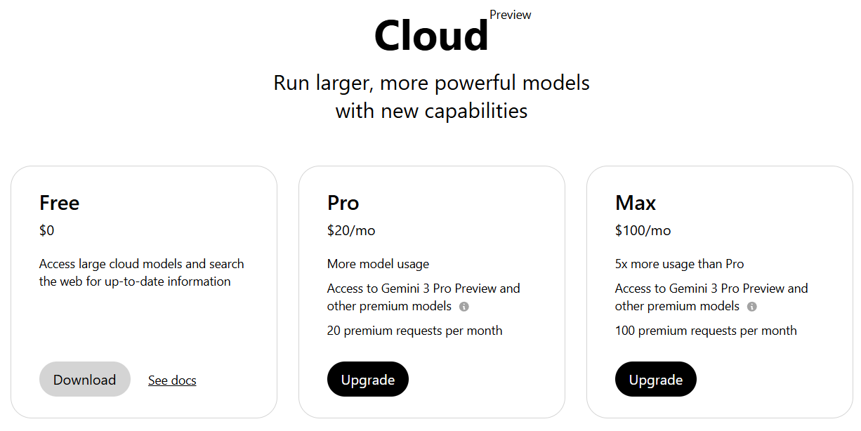 Ab jetzt kann man keine Cloud Modelle mehr nutzen und muss sich wieder auf die lokale GPU verlassen oder den PRO bzw. MAX Plan kaufen.