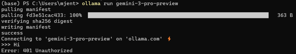 So nutzt man „gemini-3-pro-preview“ in ollama und vermeidet „Error: 401 Unauthorized“