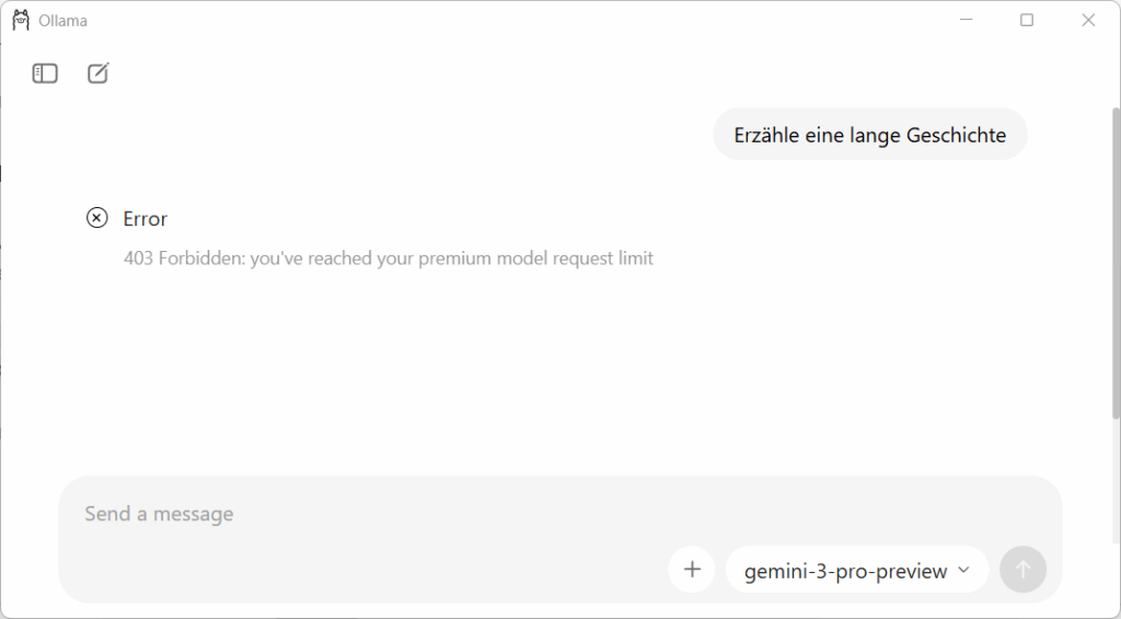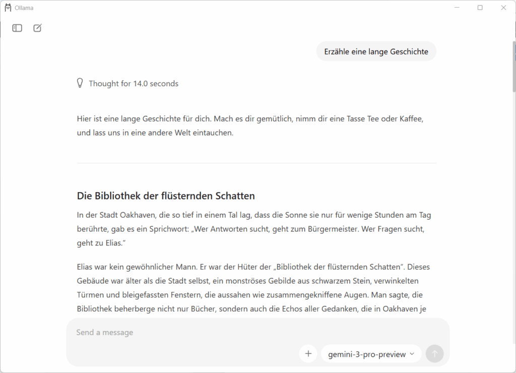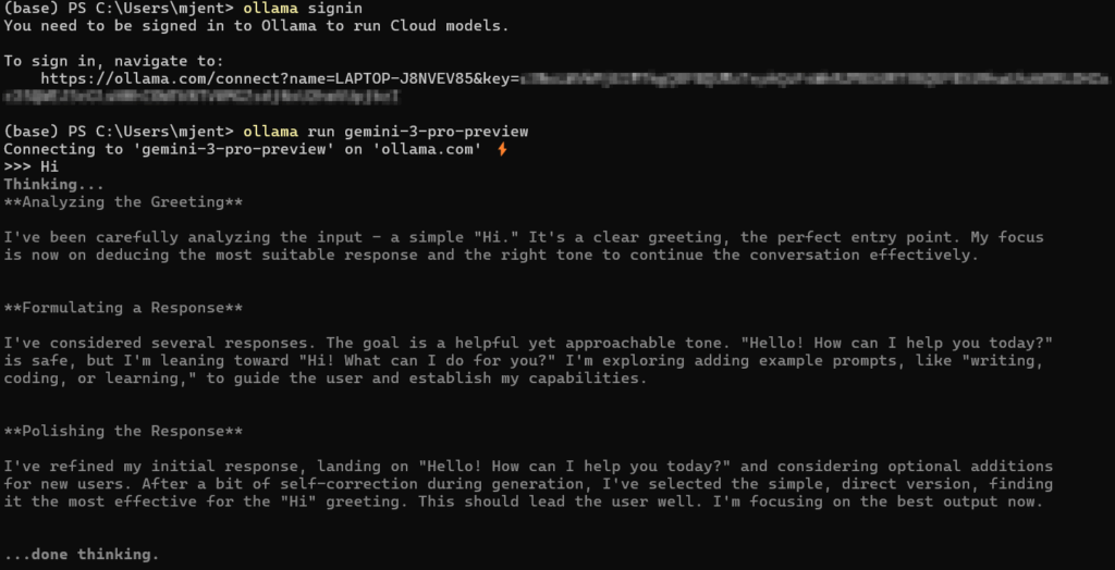 Mit dem Befehlollama run gemini-3-pro-preview kann man dann das Cloud Modell nutzen.